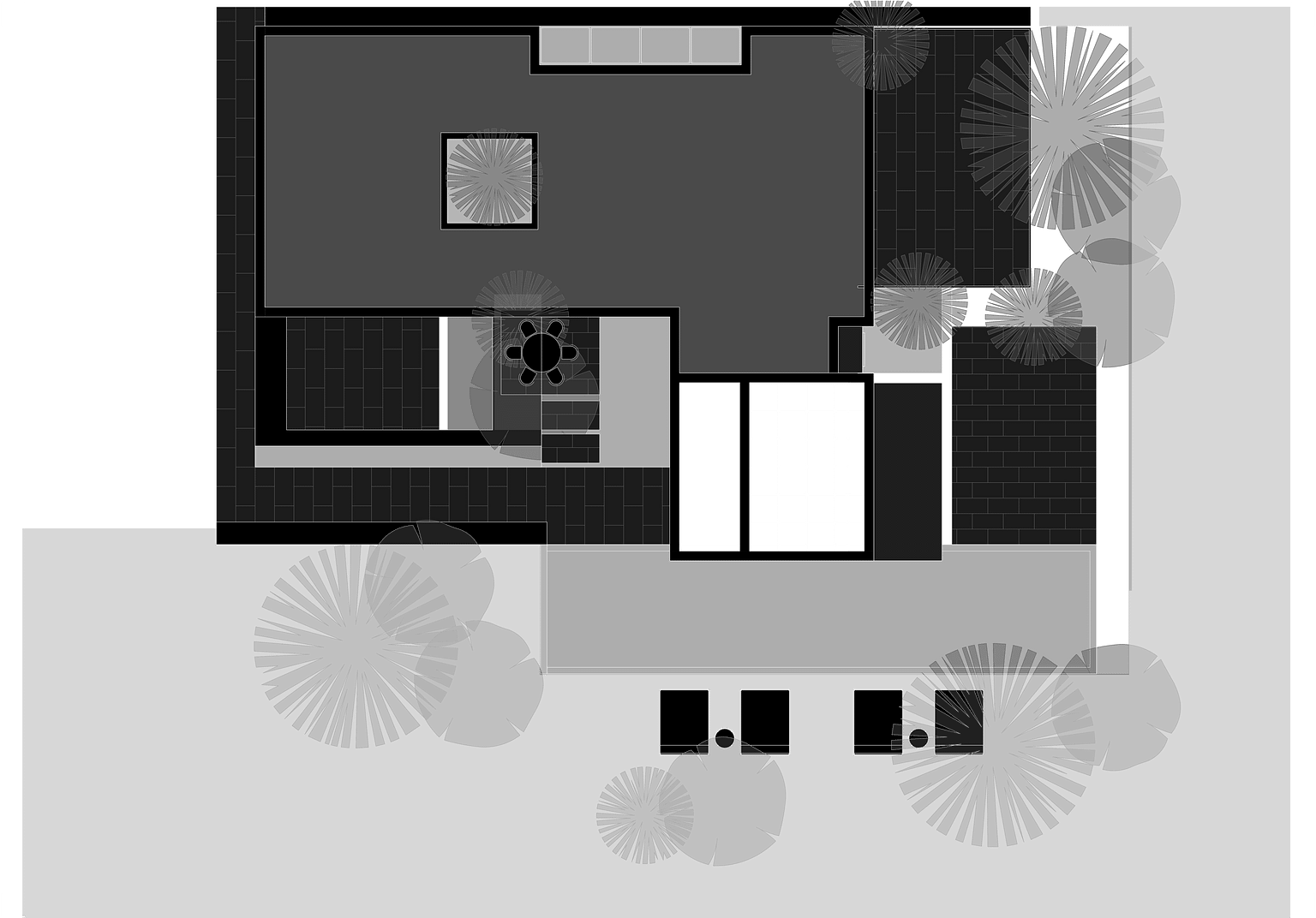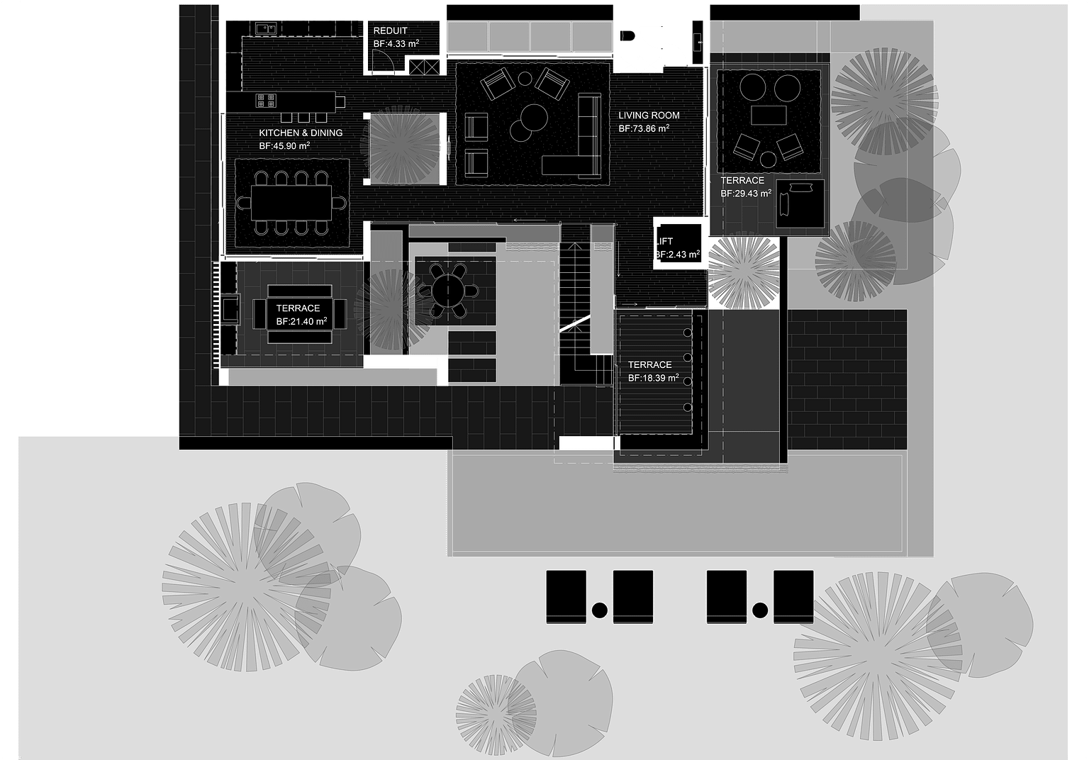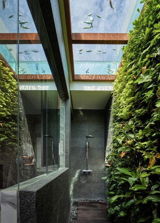 The ground floor formes the private area of the building. Bathrooms, where every shower seems part of a steady flowing stream, throughout the whole building. Thin walkways, pools and waterfalls create an adventurous trop